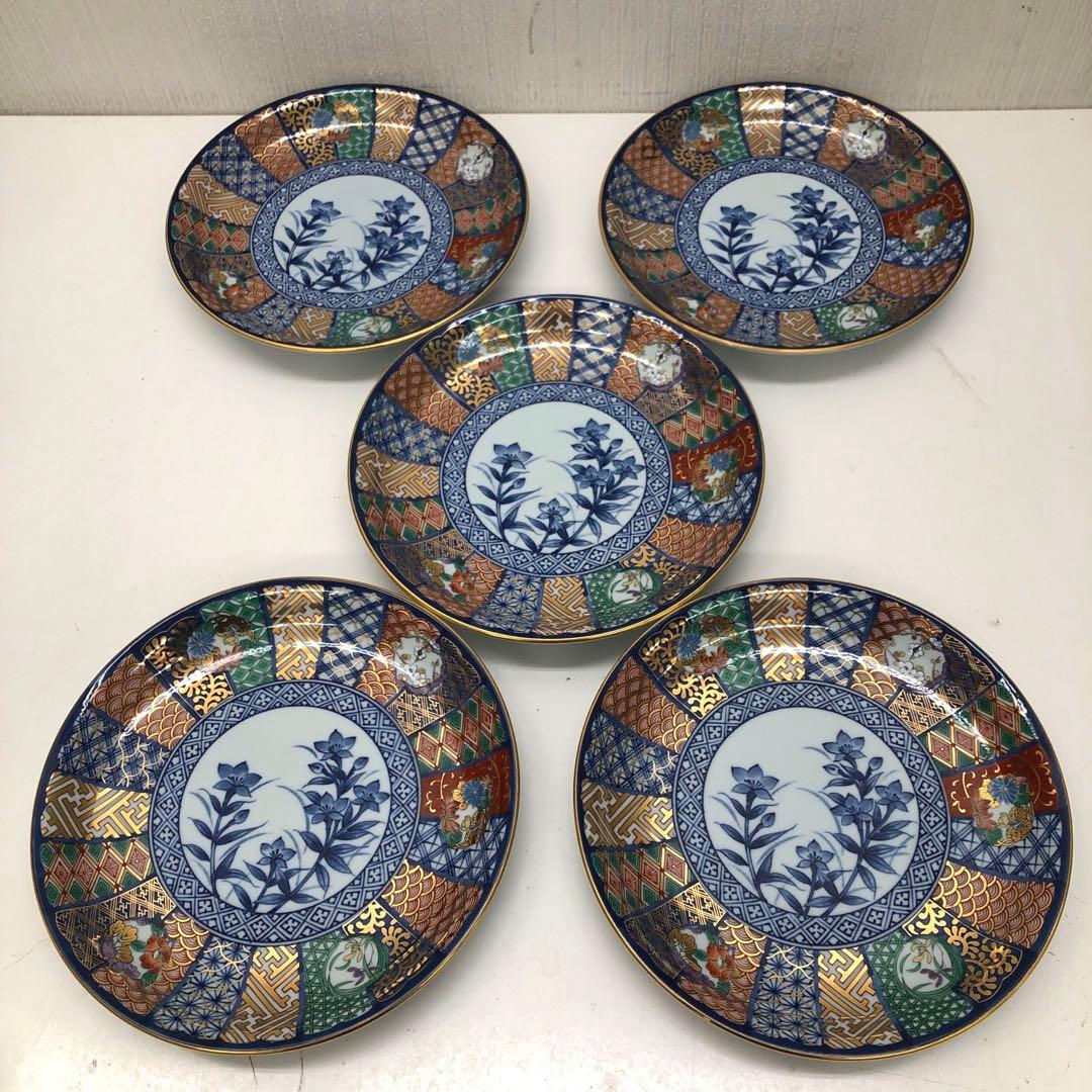 九谷焼 正峰窯 青粒鉄仙 花鳥文 銘々皿揃 5客 美品